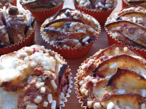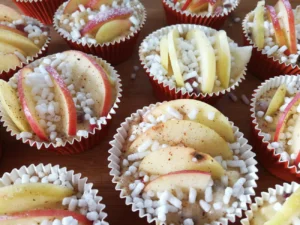 - Tagliare una mela a fettine di circa 3mm di spessore, senza sbucciarla. Inserire le fettine nei pirottini, spingendole verso il fondo (circa 3-4 fettine per Muffin)