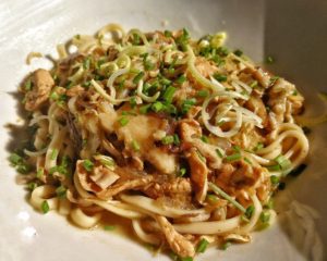Mettere il trito in un tegame con l'olio di sesamo e far soffriggere per 2-3 minuti, quindi aggiungere il pollo tagliato a striscione sottili e far cuocere il tutto per circa 5 minuti.