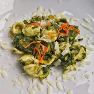 Scolare le Orecchiette e versarle nella padella in cui ci sono le cime, saltando per un paio di minuti il tutto a fuoco vivo dopo aver cosparso con il pane grattugiato precedentemente fatto tostare.