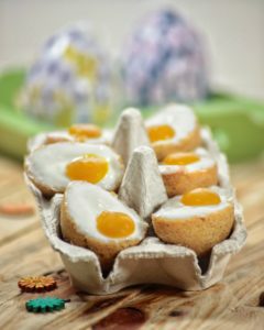Versate il composto negli stampi a forma di uovo ed infornate in forno caldo a 180°C per 20°minuti. Una volta cotti sfornateli e fateli raffreddare completamente prima di sformarli.