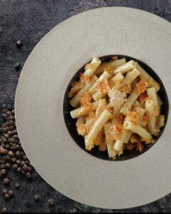 Ora è il momento di aggiungere direttamente nei piatti di portata la cialda di Mozzarella sbriciolata a mano grossolanamente, una ulteriore macinata di Pepe nero e servire. Vi consigliamo di servire il piatto tiepido e non caldissimo, per apprezzarne al meglio la cremosità ed il gusto !
