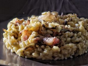A cottura ultimata del Riso spegniamo la fiamma, aggiungiamo il Tomino e mantechiamo aggiungendo anche un cucchiaio di Aceto di Mele. Regoliamo il Sale, per ultimo uniamo i Carciofi ed il Guanciale croccanti e serviamo subito con abbondante Pepe Nero