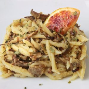 Trofie con Carciofi, Guanciale e Arancia Rossa all'Aglio Orsino e Cardamomo